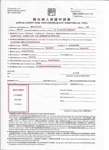 最後把必備文件+觀光個人簽證申請書+護照正本+NTD1200一同拿到馬尼拉辦事處申請菲律賓簽證就可以了~!